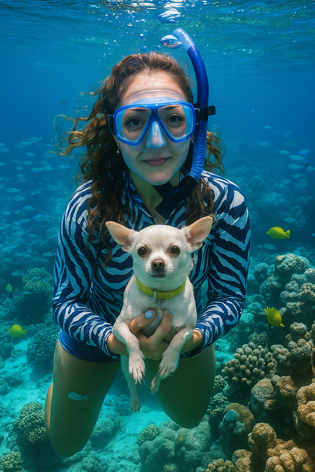 "En cada aventura bajo el mar, Theo —mi inseparable compañero de cuatro patas— siempre está ahí, vigilando desde la orilla y robándose todas las miradas."